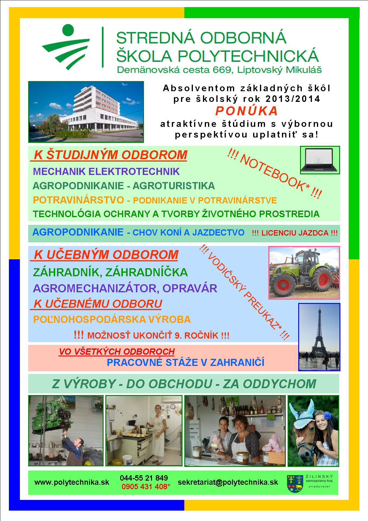 Pre záujemcov o štúdium máme širokú ponuku odborov s maturitou i s výučným listom. Vyučujeme odbory pre uchádzačov s veľmi dobrými študijnými predpokladmi, ako aj pre žiakov so slabším prospechom.